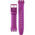 Dieses Swatch Uhrarmband ist aus silikon gefertigt und wird mit stahlstifte an der Uhr befestigt. Das Band hat eine Breite von 19.7 mm und wird mit einer dornschließe geschlossen. Das Uhrenarmband hat keine gerade Halterung, was bedeutet, dass dieses Band nur für die unten aufgeführten Uhren geeignet ist.