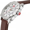 Diese Swiss Military Hanowa Uhr hat ein Edelstahl Gehäuse mit einem Durchmesser von 43 mm und ist mit einem Armband aus Leder versehen. In der Uhr arbeitet ein Ronda Uhrwerk. Das Glas der Uhr besteht aus Sapphir - Glas.