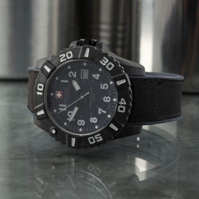 Diese Swiss Military Hanowa Uhr hat ein Carbon Gehäuse mit einem Durchmesser von 45 mm und ist mit einem Armband aus Textil über Silikon versehen. In der Uhr arbeitet ein Ronda Uhrwerk. Das Glas der Uhr besteht aus Mineral - Glas.
