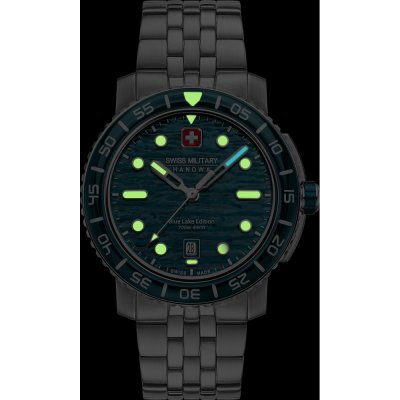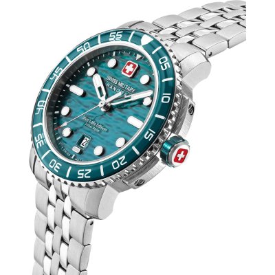 Die Uhr ist wasserdicht bis 20 ATM. Dies bedeutet, dass die Uhr zum Tauchen geeignet ist.. Die Uhr wird mit Swiss Military 3+2 geliefert.