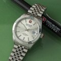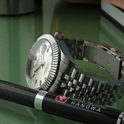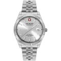 Diese Swiss Military Hanowa Uhr hat ein Edelstahl Gehäuse mit einem Durchmesser von 41 mm und ist mit einem Armband aus Edelstahl versehen. In der Uhr arbeitet ein Soprod Uhrwerk. Das Glas der Uhr besteht aus Sapphir - Glas.