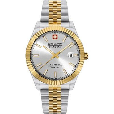 Diese Swiss Military Hanowa Uhr hat ein Edelstahl Gehäuse mit einem Durchmesser von 41 mm und ist mit einem Armband aus Edelstahl versehen. In der Uhr arbeitet ein Soprod Uhrwerk. Das Glas der Uhr besteht aus Sapphir - Glas.