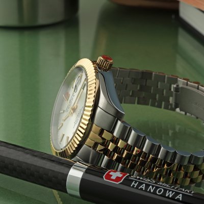 Die Uhr ist wasserdicht bis 10 ATM. Das bedeutet, dass die Uhr zum Schwimmen geeignet ist.. Die Uhr wird mit Swiss Military 3+2 geliefert.