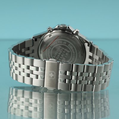 Diese Swiss Military Hanowa Uhr hat ein Edelstahl Gehäuse mit einem Durchmesser von 42 mm und ist mit einem Armband aus Edelstahl versehen. In der Uhr arbeitet ein Ronda Uhrwerk. Das Glas der Uhr besteht aus Sapphir - Glas.