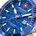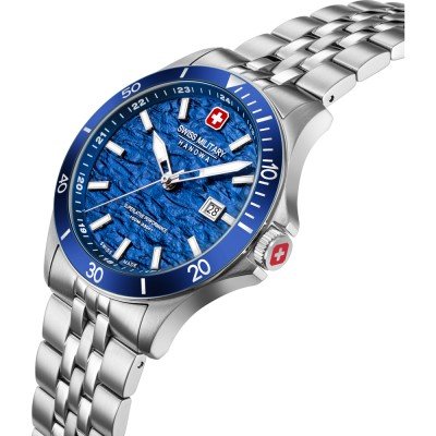 Diese Swiss Military Hanowa Uhr hat ein Edelstahl Gehäuse mit einem Durchmesser von 42 mm und ist mit einem Armband aus Edelstahl versehen. In der Uhr arbeitet ein Ronda Uhrwerk. Das Glas der Uhr besteht aus Sapphir - Glas.