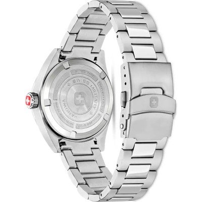 Diese Swiss Military Hanowa Uhr hat ein Edelstahl Gehäuse mit einem Durchmesser von 42 mm und ist mit einem Armband aus Edelstahl versehen. In der Uhr arbeitet ein Ronda Uhrwerk. Das Glas der Uhr besteht aus Sapphir - Glas.