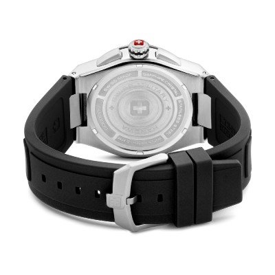 Diese Swiss Military Hanowa Uhr hat ein Edelstahl Gehäuse mit einem Durchmesser von 43 mm und ist mit einem Armband aus Kautschuk versehen. In der Uhr arbeitet ein Ronda Uhrwerk. Das Glas der Uhr besteht aus Sapphir - Glas.