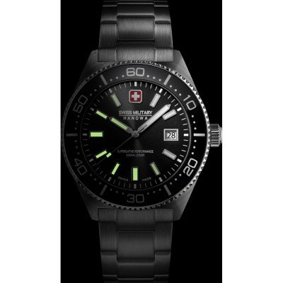 Diese Swiss Military Hanowa Uhr hat ein Edelstahl Gehäuse mit einem Durchmesser von 43 mm und ist mit einem Armband aus Edelstahl versehen. In der Uhr arbeitet ein Ronda Uhrwerk. Das Glas der Uhr besteht aus Sapphir - Glas.