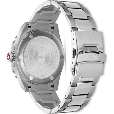 Diese Swiss Military Hanowa Uhr hat ein Edelstahl Gehäuse mit einem Durchmesser von 44 mm und ist mit einem Armband aus Edelstahl versehen. In der Uhr arbeitet ein Ronda Uhrwerk. Das Glas der Uhr besteht aus Sapphir - Glas.