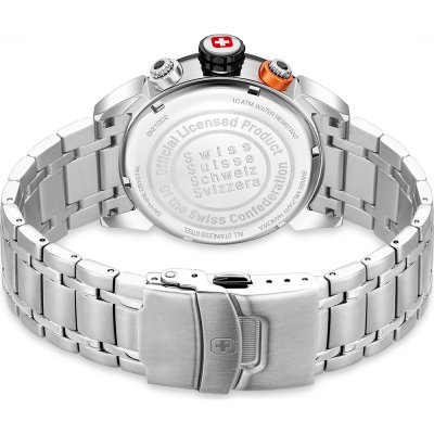 Diese Swiss Military Hanowa Uhr hat ein Edelstahl Gehäuse mit einem Durchmesser von 45 mm und ist mit einem Armband aus Edelstahl versehen. In der Uhr arbeitet ein Ronda Uhrwerk. Das Glas der Uhr besteht aus Sapphir - Glas.