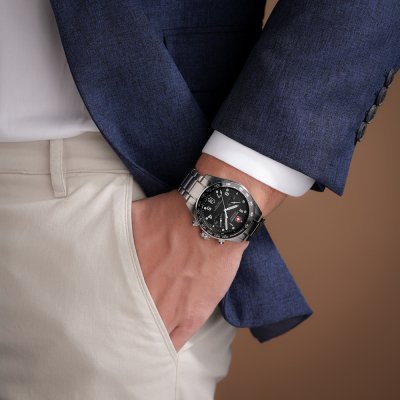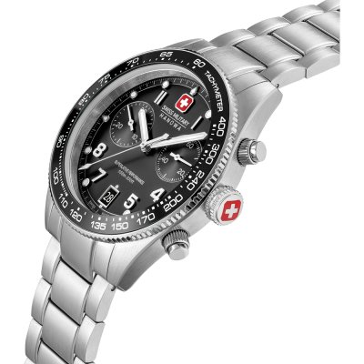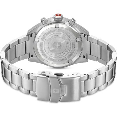 Diese Swiss Military Hanowa Uhr hat ein Edelstahl Gehäuse mit einem Durchmesser von 43 mm und ist mit einem Armband aus Edelstahl versehen. In der Uhr arbeitet ein Ronda Uhrwerk. Das Glas der Uhr besteht aus Sapphir - Glas.