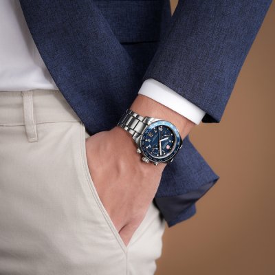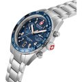 Diese Swiss Military Hanowa Uhr hat ein Edelstahl Gehäuse mit einem Durchmesser von 43 mm und ist mit einem Armband aus Edelstahl versehen. In der Uhr arbeitet ein Ronda Uhrwerk. Das Glas der Uhr besteht aus Sapphir - Glas.