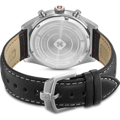 Diese Swiss Military Hanowa Uhr hat ein Edelstahl Gehäuse mit einem Durchmesser von 43 mm und ist mit einem Armband aus Leder versehen. In der Uhr arbeitet ein Ronda Uhrwerk. Das Glas der Uhr besteht aus Sapphir - Glas.