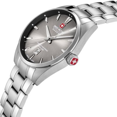 Diese Swiss Military Hanowa Uhr hat ein Edelstahl Gehäuse mit einem Durchmesser von 42 mm und ist mit einem Armband aus Edelstahl versehen. In der Uhr arbeitet ein Ronda Uhrwerk. Das Glas der Uhr besteht aus Sapphir - Glas.