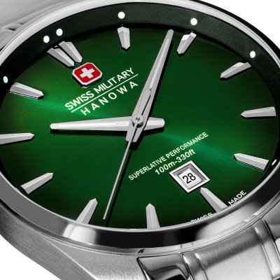 Diese Swiss Military Hanowa Uhr hat ein Edelstahl Gehäuse mit einem Durchmesser von 42 mm und ist mit einem Armband aus Edelstahl versehen. In der Uhr arbeitet ein Ronda Uhrwerk. Das Glas der Uhr besteht aus Sapphir - Glas.