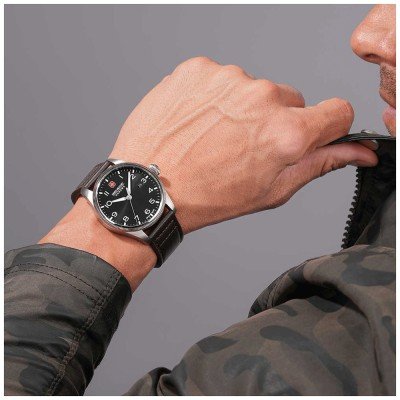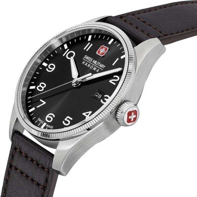 Diese Swiss Military Hanowa Uhr hat ein Edelstahl Gehäuse mit einem Durchmesser von 43 mm und ist mit einem Armband aus Leder versehen. In der Uhr arbeitet ein Ronda Uhrwerk. Das Glas der Uhr besteht aus Sapphir - Glas.