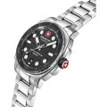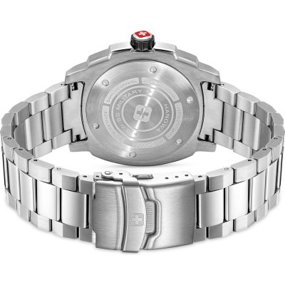Diese Swiss Military Hanowa Uhr hat ein Edelstahl Gehäuse mit einem Durchmesser von 40 mm und ist mit einem Armband aus Edelstahl versehen. In der Uhr arbeitet ein Ronda Uhrwerk. Das Glas der Uhr besteht aus Sapphir - Glas.