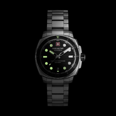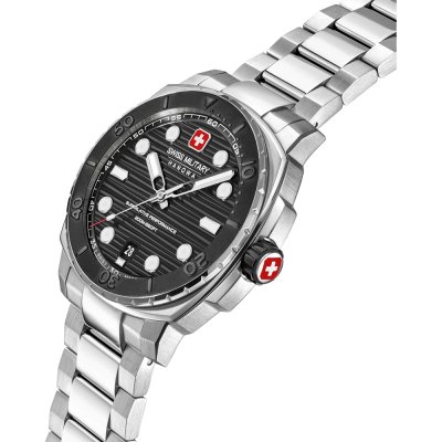 Die Uhr ist wasserdicht bis 20 ATM. Dies bedeutet, dass die Uhr zum Tauchen geeignet ist.. Die Uhr wird mit Swiss Military 3+2 geliefert.