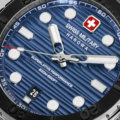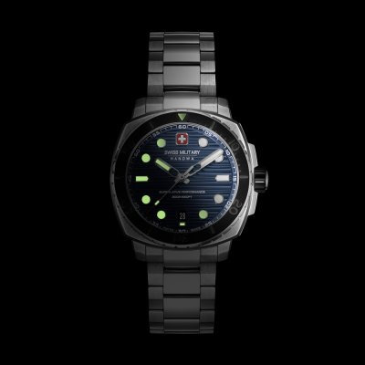 Die Uhr ist wasserdicht bis 20 ATM. Dies bedeutet, dass die Uhr zum Tauchen geeignet ist.. Die Uhr wird mit Swiss Military 3+2 geliefert.