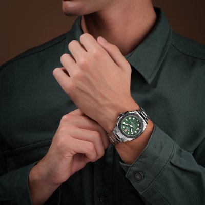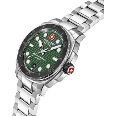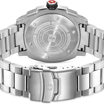 Die Uhr ist wasserdicht bis 20 ATM. Dies bedeutet, dass die Uhr zum Tauchen geeignet ist.. Die Uhr wird mit Swiss Military 3+2 geliefert.