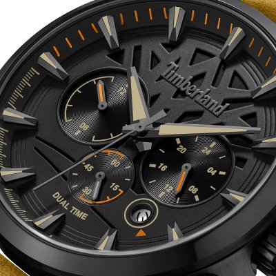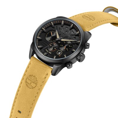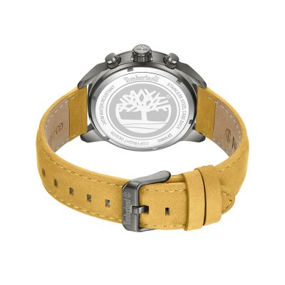 Diese Timberland Uhr hat ein Edelstahl Gehäuse mit einem Durchmesser von 42 mm und ist mit einem Armband aus Leder versehen.