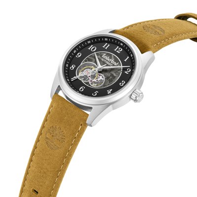 Diese Timberland Uhr hat ein Edelstahl Gehäuse mit einem Durchmesser von 43 mm und ist mit einem Armband aus Leder versehen. In der Uhr arbeitet ein Seagull Uhrwerk. Das Glas der Uhr besteht aus Mineral - Glas.