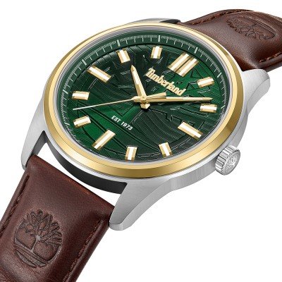 Diese Timberland Uhr hat ein Edelstahl Gehäuse mit einem Durchmesser von 45 mm und ist mit einem Armband aus Leder versehen. In der Uhr arbeitet ein Seiko Uhrwerk. Das Glas der Uhr besteht aus Mineral - Glas.