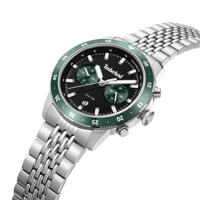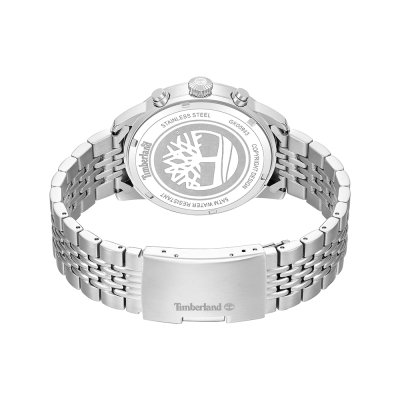 Diese Timberland Uhr hat ein Edelstahl Gehäuse mit einem Durchmesser von 44 mm und ist mit einem Armband aus Edelstahl versehen. In der Uhr arbeitet ein Seiko Instruments Inc. Uhrwerk. Das Glas der Uhr besteht aus Mineral - Glas.