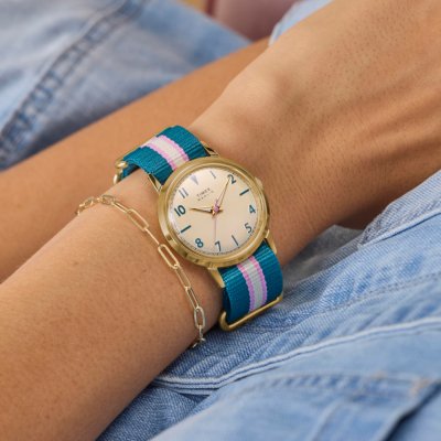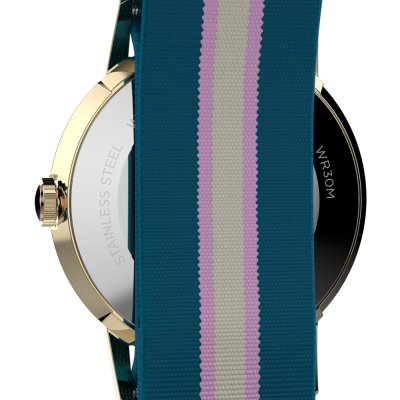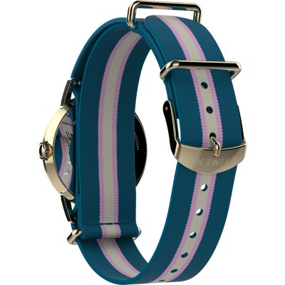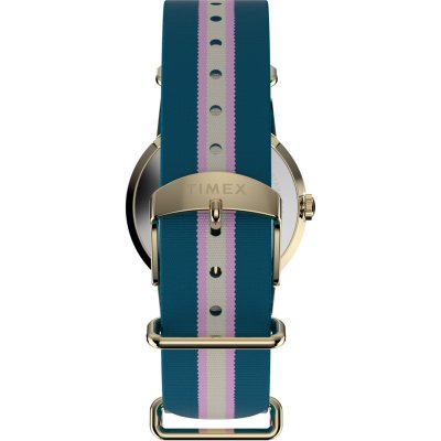Diese Timex Uhr hat ein Edelstahl Gehäuse mit einem Durchmesser von 34 mm und ist mit einem Armband aus Textil versehen. In der Uhr arbeitet ein Timex Uhrwerk. Das Glas der Uhr besteht aus Acryl - Glas.