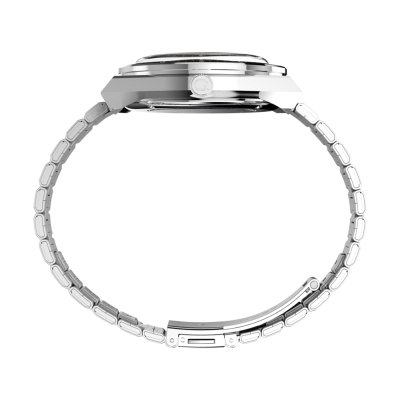 Diese Timex Uhr hat ein Edelstahl Gehäuse mit einem Durchmesser von 40 mm und ist mit einem Armband aus Edelstahl versehen. In der Uhr arbeitet ein Timex Uhrwerk. Das Glas der Uhr besteht aus Acryl - Glas.