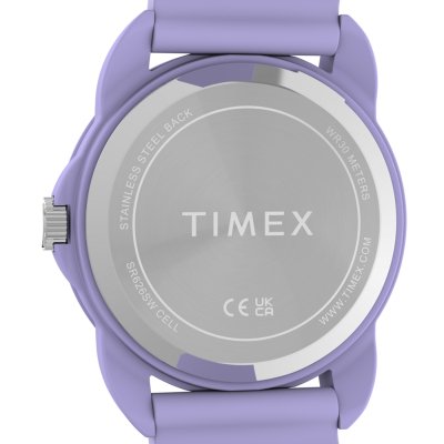 Diese Timex Uhr hat ein Kunstharz Gehäuse mit einem Durchmesser von 30 mm und ist mit einem Armband aus Kautschuk versehen. In der Uhr arbeitet ein Timex Uhrwerk. Das Glas der Uhr besteht aus Acryl - Glas.