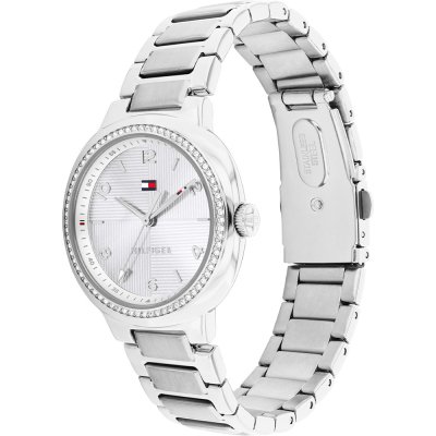 Diese Tommy Hilfiger Uhr hat ein Edelstahl Gehäuse mit einem Durchmesser von 32 mm und ist mit einem Armband aus Edelstahl versehen. In der Uhr arbeitet ein Seiko Uhrwerk. Das Glas der Uhr besteht aus Mineral - Glas.