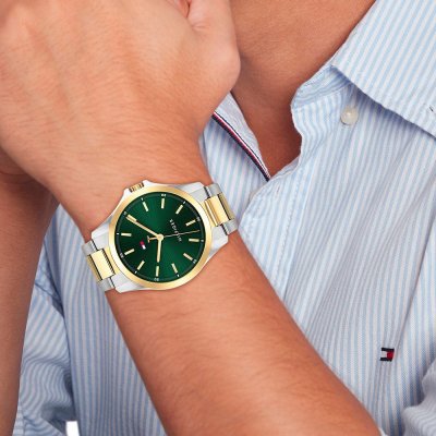 Diese Tommy Hilfiger Uhr hat ein Edelstahl Gehäuse mit einem Durchmesser von 43 mm und ist mit einem Armband aus Edelstahl versehen. In der Uhr arbeitet ein Seiko Uhrwerk. Das Glas der Uhr besteht aus Mineral - Glas.