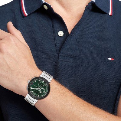 Diese Tommy Hilfiger Uhr hat ein Edelstahl Gehäuse mit einem Durchmesser von 44 mm und ist mit einem Armband aus Edelstahl versehen. In der Uhr arbeitet ein Seiko Instruments Inc. Uhrwerk. Das Glas der Uhr besteht aus Mineral - Glas.