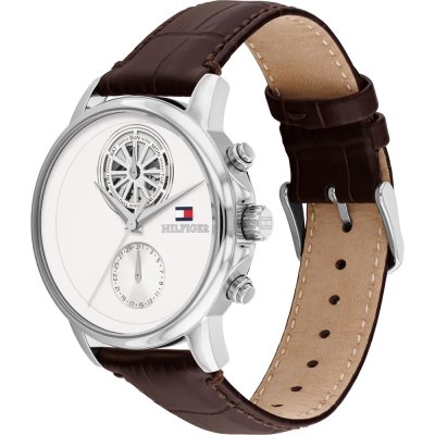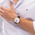 Diese Tommy Hilfiger Uhr hat ein Edelstahl Gehäuse mit einem Durchmesser von 40 mm und ist mit einem Armband aus Leder versehen. In der Uhr arbeitet ein Seiko Instruments Inc. Uhrwerk. Das Glas der Uhr besteht aus Mineral - Glas.
