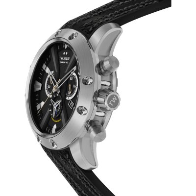 Diese TW Steel Uhr hat ein Edelstahl Gehäuse mit einem Durchmesser von 47 mm und ist mit einem Armband aus Leder oder Silikon versehen. In der Uhr arbeitet ein Ronda Uhrwerk. Das Glas der Uhr besteht aus Einfaches reflektionsfreies Saphirglas - Glas.