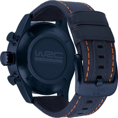 Dieser Special Edition-Chronograph ist in den Farben der Rallye-Weltmeisterschaft Blau und Orange gehalten und trägt das WRC-Logo auf dem Gehäuseboden.