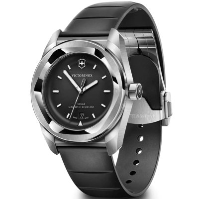 Diese Victorinox Uhr hat ein Edelstahl Gehäuse mit einem Durchmesser von 39 mm und ist mit einem Armband aus Kautschuk versehen. In der Uhr arbeitet ein Ronda Uhrwerk. Das Glas der Uhr besteht aus Einfaches reflektionsfreies Saphirglas - Glas.