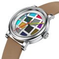 Diese Walter Gropius Uhr hat ein Edelstahl Gehäuse mit einem Durchmesser von 40 mm und ist mit einem Armband aus Leder versehen. In der Uhr arbeitet ein Seiko Instruments Inc. Uhrwerk. Das Glas der Uhr besteht aus Doppel antireflex Saphirglas - Glas.