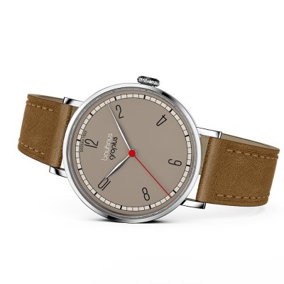 Diese Walter Gropius Uhr hat ein Edelstahl Gehäuse mit einem Durchmesser von 38 mm und ist mit einem Armband aus Leder versehen. In der Uhr arbeitet ein Miyota Uhrwerk. Das Glas der Uhr besteht aus Doppel antireflex Saphirglas - Glas.