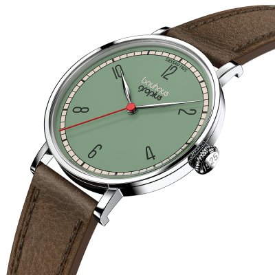 Diese Walter Gropius Uhr hat ein Edelstahl Gehäuse mit einem Durchmesser von 38 mm und ist mit einem Armband aus Leder versehen. In der Uhr arbeitet ein Miyota Uhrwerk. Das Glas der Uhr besteht aus Doppel antireflex Saphirglas - Glas.