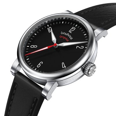 Diese Walter Gropius Uhr hat ein Edelstahl Gehäuse mit einem Durchmesser von 40 mm und ist mit einem Armband aus Leder versehen. In der Uhr arbeitet ein Seiko Instruments Inc. Uhrwerk. Das Glas der Uhr besteht aus Doppel antireflex Saphirglas - Glas.