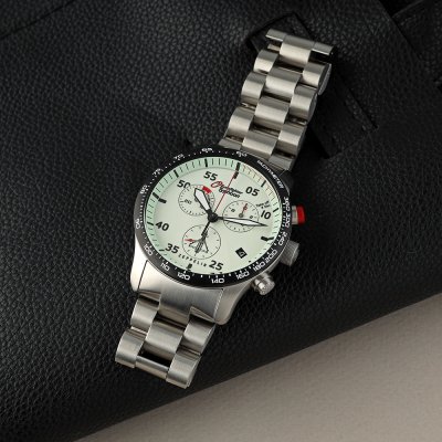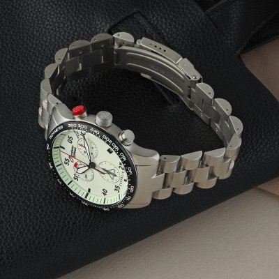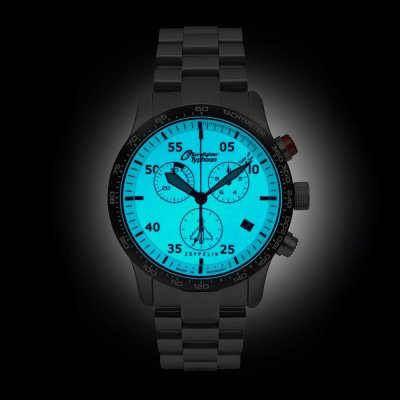 Diese Zeppelin Uhr hat ein Edelstahl Gehäuse mit einem Durchmesser von 43 mm und ist mit einem Armband aus Edelstahl versehen. In der Uhr arbeitet ein ETA Uhrwerk. Das Glas der Uhr besteht aus K1 Mineral - Glas.