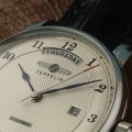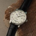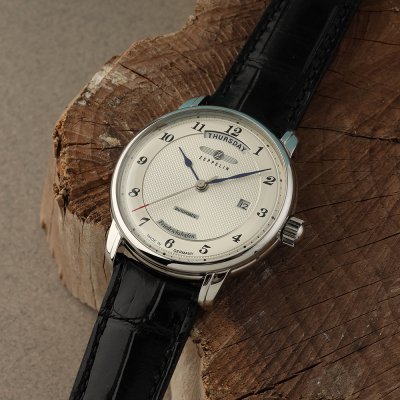 Diese Zeppelin Uhr hat ein Edelstahl Gehäuse mit einem Durchmesser von 40 mm und ist mit einem Armband aus Leder versehen. In der Uhr arbeitet ein Miyota Uhrwerk. Das Glas der Uhr besteht aus K1 Mineral - Glas.