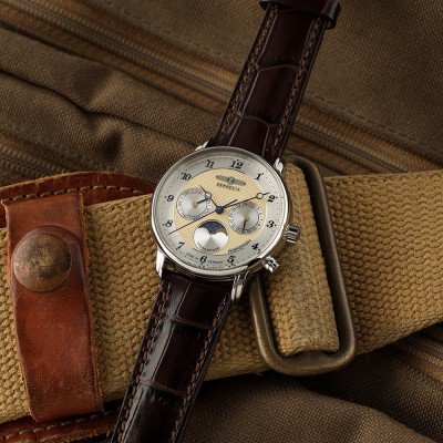 Diese Zeppelin Uhr hat ein Edelstahl Gehäuse mit einem Durchmesser von 36 mm und ist mit einem Armband aus Leder versehen. In der Uhr arbeitet ein Ronda Uhrwerk. Das Glas der Uhr besteht aus K1 Mineral - Glas.