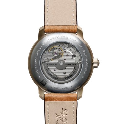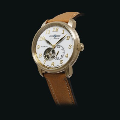 Diese Zeppelin Uhr hat ein Edelstahl Gehäuse mit einem Durchmesser von 40 mm und ist mit einem Armband aus Leder versehen. In der Uhr arbeitet ein Miyota Uhrwerk. Das Glas der Uhr besteht aus K1 Mineral - Glas.