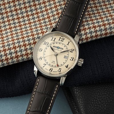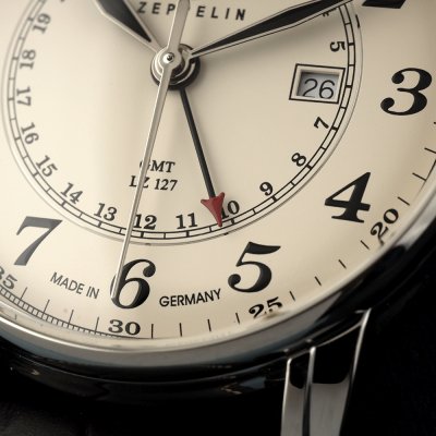 Diese Zeppelin Uhr hat ein Edelstahl Gehäuse mit einem Durchmesser von 42 mm und ist mit einem Armband aus Leder versehen. In der Uhr arbeitet ein Ronda Uhrwerk. Das Glas der Uhr besteht aus K1 Mineral - Glas.