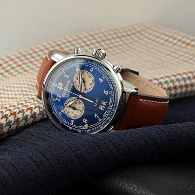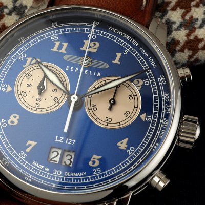 Diese Zeppelin Uhr hat ein Edelstahl Gehäuse mit einem Durchmesser von 40 mm und ist mit einem Armband aus Leder versehen. In der Uhr arbeitet ein Ronda Uhrwerk. Das Glas der Uhr besteht aus K1 Mineral - Glas.