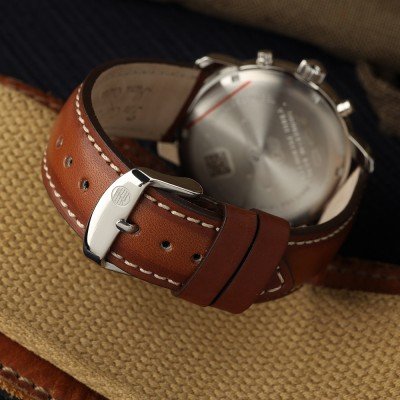Diese Zeppelin Uhr hat ein Edelstahl Gehäuse mit einem Durchmesser von 40 mm und ist mit einem Armband aus Leder versehen. In der Uhr arbeitet ein Ronda Uhrwerk. Das Glas der Uhr besteht aus K1 Mineral - Glas.