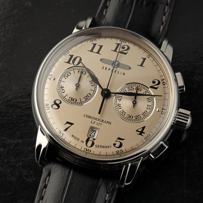 Diese Zeppelin Uhr hat ein Edelstahl Gehäuse mit einem Durchmesser von 42 mm und ist mit einem Armband aus Leder versehen. In der Uhr arbeitet ein Miyota Uhrwerk. Das Glas der Uhr besteht aus K1 Mineral - Glas.
